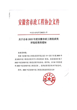 根據《安徽市政工程優質獎評選辦法》和《關于開展2022年度安徽市政工程優質獎評審工作的通知》要求,安徽省市政工程協會組織開展了2022年度安徽市政工程優質獎評選活動。黃山市建工集團股份有限公司承建的黟縣五里轉盤至開發區段道路及雨污管網升級改造項目榮獲2022年度安徽市政工程優質獎。