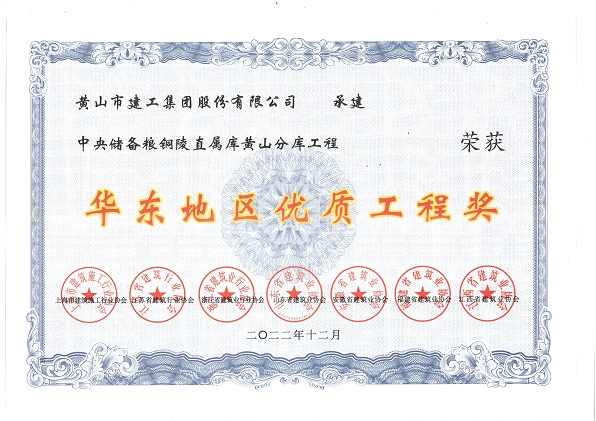 由黃山建工集團(tuán)股份有限公司承建的“中央儲備糧銅陵直屬庫黃山分庫工程”榮獲華東地區(qū)各省建筑業(yè)協(xié)會聯(lián)合頒發(fā)的“華東地區(qū)優(yōu)質(zhì)工程獎”。