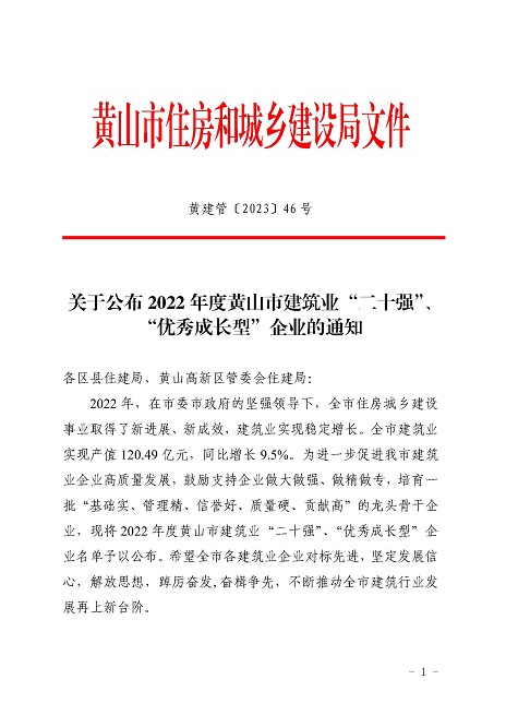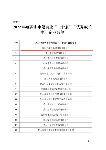 近日,黃山市住房和城鄉建設局發布的《2022年度黃山市建筑業二十強企名單》中,黃山建工集團股份有限公司榮獲2022年“黃山市建筑業企業二十強”。