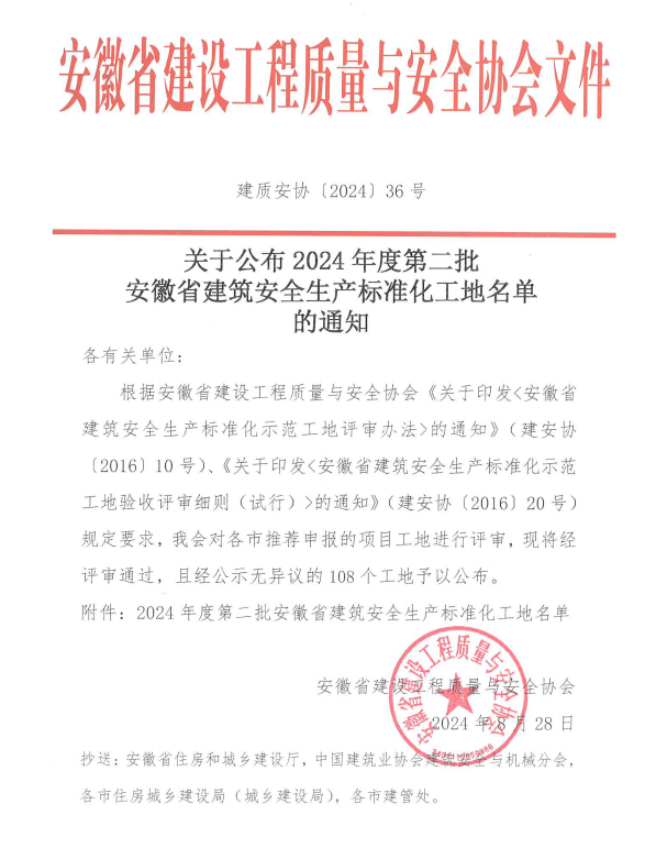近日,安徽省建設(shè)工程質(zhì)量與安全協(xié)會(huì)公布2024年度第二批安徽省建筑安全生產(chǎn)標(biāo)準(zhǔn)化工地名單,由黃山建工集團(tuán)承建的國網(wǎng)安徽黃山供電公司運(yùn)維檢修及信息通信用房項(xiàng)目光榮上榜。